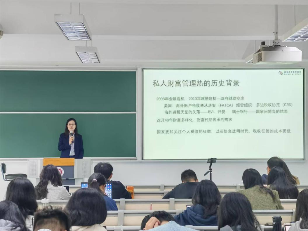 李律师首先介绍了私人财富管理的时代背景,接着介绍了私人财富管理、私人财富管理法律服务的定义。服务的目的在于在全球不同的司法管辖区内,个人或家族为保有和延续其财富而做出的合规安排,以财富助力人的幸福。李律师结合全职太太的婚姻资产保全案例、创一代股权传承案例等财富管理法律服务案例,为同学们展示了律师在综合运用民法典婚姻编、合同编、公司法、税法等法律规定以及配合保险、信托等金融工具,为客户解决财富保全与传承等切实问题的律师经验。最后,李律师也分享了在做私人财富管理法律业务过程中学习和了解到的金融工具的作用,并分享了律师间跨专业跨地域合作以及律师与税务、财务人员等合作过程中的体会。