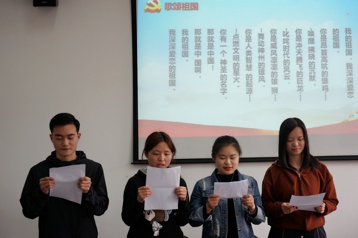 员工党员陈泉程、黄颖、汤乔乔、赵茜饱含激情地朗诵诗歌《我的祖国》,充分表达了他们对祖国的热爱之情。他们说道:“少年强中国强”,时代为年轻人及更多人提供了选择的机会和权利,每个人可以选择自己擅长或感兴趣的行业,贡献自己的价值。影片中一个个恢宏创举的背后,是一个个劳动者的身影,他们用中国的力量,实现了自我的价值与梦想,更用自身的力量,实现了中国的梦想,作为一位中华儿女要去做一块砖,去铺设民族走向辉煌的路轨,为祖国的春天奉献自己生命的绿色,只有这样,才能无愧于这个时代、这面旗帜所赋予我们的使命。