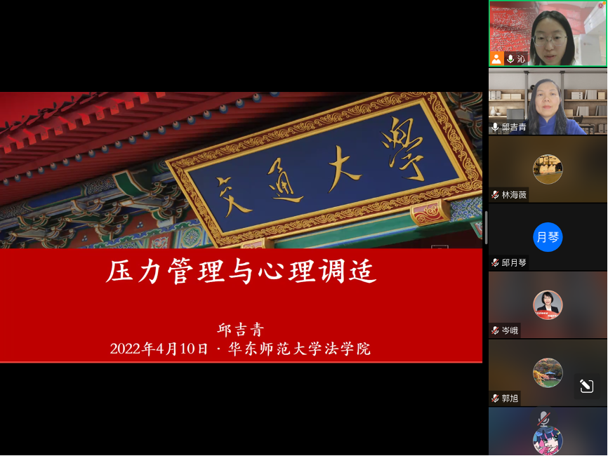 3月份,一场突如其来的疫情打乱了师生们的生活与学习。为了缓解师生的迷茫焦虑等负面情绪,4月10日晚,yl23411永利集团特邀请上海交通大学妇女研究中心特聘研究员邱吉青博士带来“压力管理与心理调适”心理健康教育线上分享,吸引60余名师生参与互动。本次活动由yl23411永利集团经理助理、院团委书记王沁怡主持。