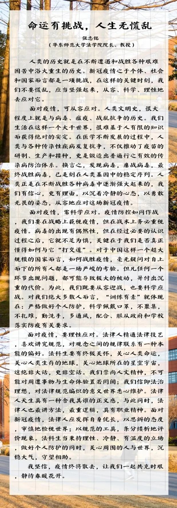 张志铭经理撰写《命运有挑战,人生无慌乱》一文,号召全院师生面对疫情不要慌乱,应当坚强起来,从容、科学、理性地去应对。副经理钱叶六教授邀请柏浪涛教授、王欢欢教授、李建星副教授、孟凡壮副教授、王家骏博士共同开展“yl23411永利集团云端论文写作指导会”, 帮助同学们解决论文写作过程中遇到的难题。各组老师先后举办 “不将就云上聊天室”“今夜不设防聊天室”、法理学科师生共同体《法律多元》线上读书报告会等活动,在关怀员工的同时为员工答疑解惑。为了缓解同学们的焦虑情绪,3月28日yl23411永利集团举行 “驱散焦虑,共同战‘疫’”线上文艺演出,吸引了500名余师生在线观看。4月10日,邀请上海交通大学妇女研究中心特聘研究员邱吉青博士带来“压力管理与心理调适”心理健康教育线上分享。