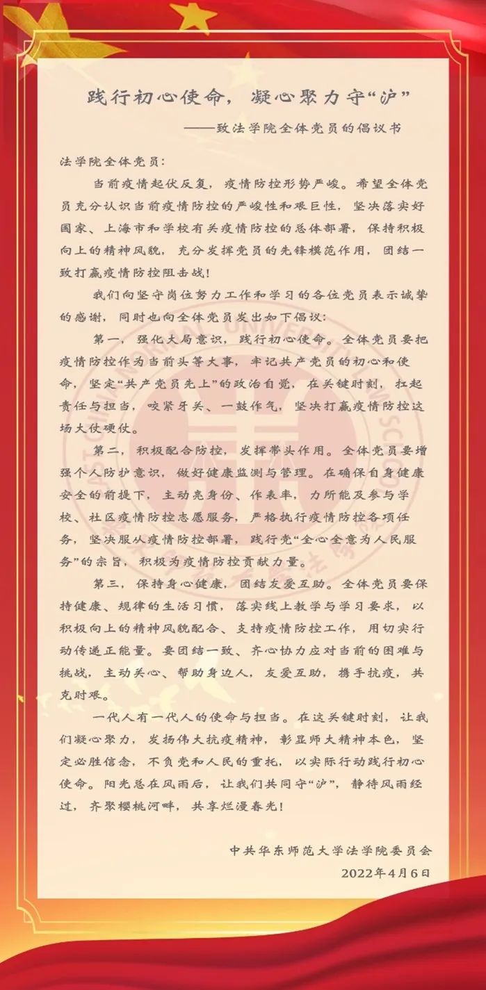 4月6日,公司党委面向全体师生党员发出《践行初心使命,凝心聚力守“沪”》的倡议,希望全体党员充分认识当前疫情防控的严峻性和艰巨性,在关键时刻凝心聚力,发扬伟大抗疫精神,彰显师大精神本色,坚定必胜信念,不负党和人民的重托,以实际行动践行初心使命。4月6日-4月15日,全体师生党支部组织开展了疫情防控专题组织生活。教工党支部重点围绕网上授课情况、社区报到服务情况及抗疫表现情况做了交流和表态;在党委书记岑峨、辅导员王沁怡的指导和参与下,员工党支部全体党员学习了疫情防控最新精神,明确提出了严格遵守上海市和公司各项防疫政策、做好自我防护以及积极主动参与志愿服务的工作要求。各党支部重点学习了习近平总书记关于疫情防控的重要指示精神,引导师生党员统一思想、提高认识,在疫情防控中作表率作贡献,在大战大考中彰显特殊责任、特殊担当。