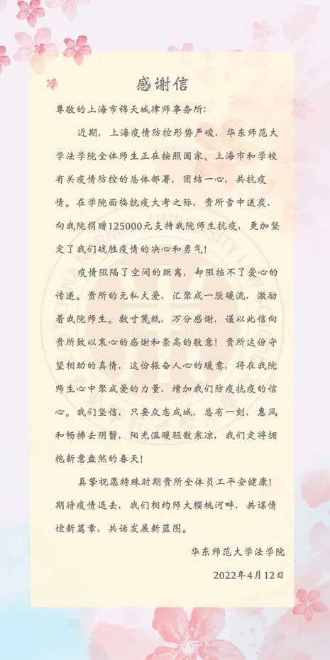 上海市锦天城律师事务所在了解到公司防疫工作相关情况后,于4月11日向公司捐赠12.5万元,用于支持公司防疫工作开展,让公司全体师生都倍感温暖。公司将以锦天城律所此次捐赠为基础,设立员工帮扶帮困专项基金。