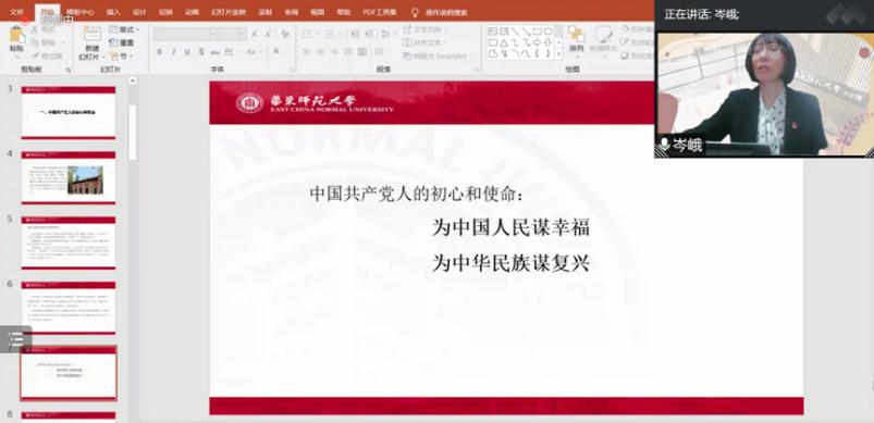 讲座伊始,岑峨播放了一首由华东师大员工创作的原创主旋律歌曲《兴业路上的初心》,以激励人心的歌词和扣人心弦的旋律拉开了本次党课的序幕。岑峨回顾了中共一大的历史和建党纪念日的由来,讲述了《共产党宣言》首个中文全译本译者陈望道的故事,和同学们一起深刻体会党的百年征程波澜壮阔,百年初心历久弥坚。