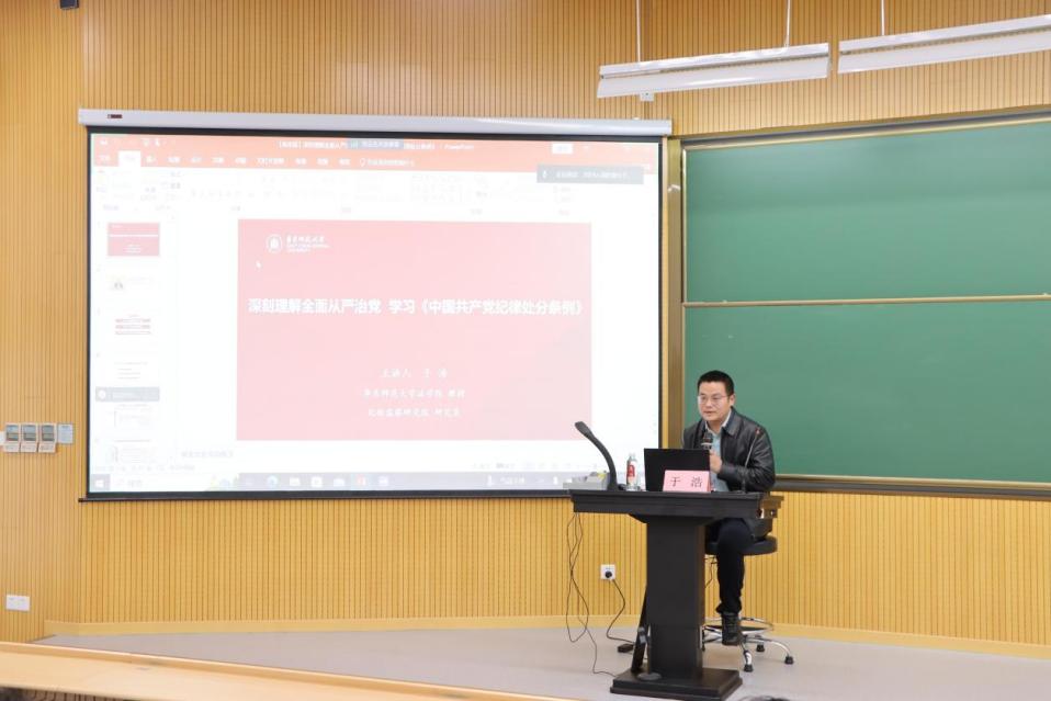讲座伊始,于浩教授首先阐述了全面从严治党的重要性和紧迫性,指出党的纪律是党的生命线,是维护党的团结统一、推进党的事业发展的重要保障,全党同志要科学把握、正确认识当前从严治党的形势,以自我革命对抗精神懈怠、消极腐败和能力不足等长期危险。他认为,党的十八大以来全面从严治党使得党内许多突出问题得到解决,但是党面临的种种考验也将长期存在。在马克思主义理论中,党的建设和发展离不开对权力的监督,要“把权力关进制度的笼子里”,重视“纪与法”。于浩教授给同学们逐条剖析《中国共产党纪律处分条例》的各项规定,深刻领会党的纪律的严肃性和权威性,明确党的纪律严于国家法律,党员必须严格遵守党的纪律,维护党的团结统一。