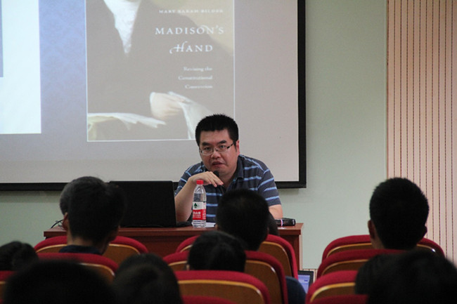田雷副教授以“1787年宪法之父”麦迪逊为切入口开始讲述,从美国宪法的基本事实、麦迪逊其人及其宪法思想和美国宪法本身三方面入手,在短短两个小时的时间内为师生们展开了一幅全景图,浓缩了大量美国宪法相关知识的精华。