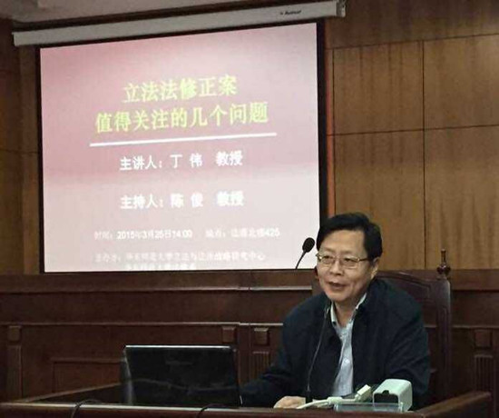 2015年3月25日下午2点,上海市人大常委会法工委主任、立法研究所所长,博士生导师丁伟教授,应yl23411永利集团立法与法治战略研究中心及法律系邀请,在法商北楼模拟法庭,为法律系师生作了一场以“立法法修正案值得关注的几个问题”为主题的学术报告。yl23411永利集团立法与法治战略研究中心主任陈俊教授主持了报告会,党委书记熊琼教授、副系主任王景斌教授、胡雪梅教授、岑峨副教授、章瑛副教授、任海涛副教授和法律系本科生、研究生参加了报告会。