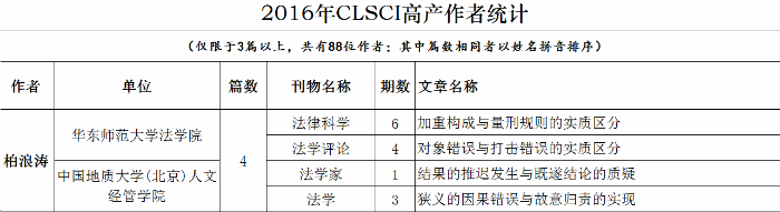 近日,中国法学会法律信息部发布了2016年度CLSCI高产作者榜单,公司柏浪涛副教授上榜,2016年柏浪涛副教授分别在《法律科学》、《法学评论》、《法学家》和《法学》上共发表论文4篇。