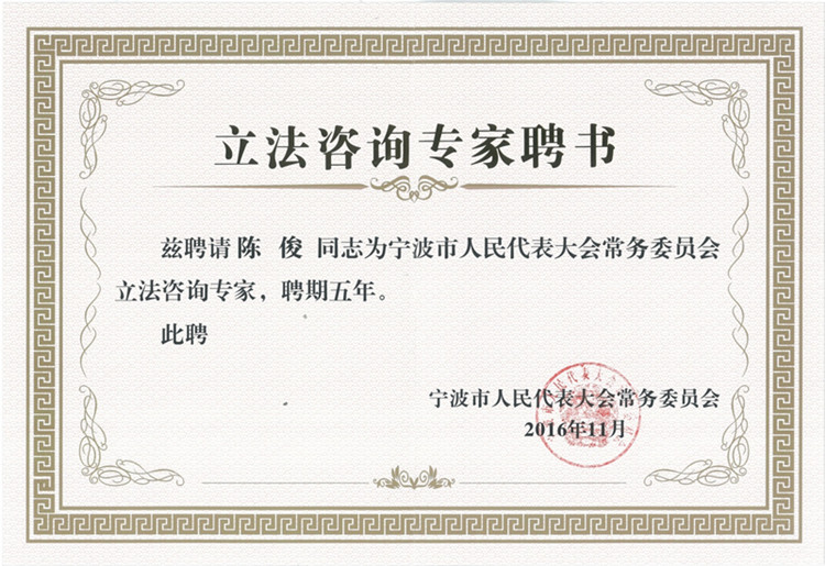 11月4日上午,宁波市人大常委会主任王勇、常委会副主任邬和民、秘书长杨剑耀、市人大法工委主任陈德良等领导与市内外相关专家共同出席宁波市人大常委会首届立法咨询专家会。陈俊教授与会并受聘担任任期五年的宁波市人大常委会立法咨询专家。