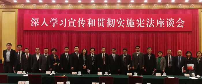由全国人大常委会办公厅、国家监察委员会机关、中央宣传部、司法部、教育部联合召开的深入学习宣传和贯彻实施宪法座谈会3月27日在京召开。中共中央政治局常委、全国人大常委会委员长栗战书出席并讲话,中共中央政治局委员、全国人大常委会副委员长王晨主持会议,全国人大常委会副委员长曹建明、万鄂湘、郝明金以及秘书长杨振武出席会议。国家监察委员会副主任杨晓超、全国人大宪法和法律委员会主任委员李飞、中宣部常务副部长王晓晖、司法部部长傅政华、教育部副部长朱之文在座谈会上发言。会议强调要把学习宣传宪法、贯彻实施宪法作为推进全面依法治国的首要任务和基础性工作,坚定宪法自信,维护宪法权威,为新时代坚持和发展中国特色社会主义提供更加有力的宪法保障。