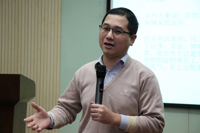 邵教授简单介绍了《法律东方主义》,邵科教授首先解释了东方主义,东方主义是一个特定的名词,是一种歪曲了东方优秀传统的主义。东方主义一定程度上是西方中心论造成的,但是,对东方主义的偏见仅仅是由于西方的偏见造成的吗?围绕发展议题和知识产权的冲突,邵科教授展开讨论,他通过举例简明扼要地说明了何为知识产权、何为发展议题。以19世纪中国与西方达成的关于知识产权协议的争论为例,点明了当时中外知识产权的争议和发展议题的普遍性。又举例美国对英国知识产权的侵犯,瑞士和荷兰对外国先进技术的模仿,许多西方国家在发展过程中也不愿放弃使用别国的知识产权,以此说明清末的时候为了发展对国外知识产权的不得不的模仿。邵教授提出东方主义不仅仅是因为西方中心论对中国的偏见,还由于国人对历史文化的不自信,对本国文化的无知和否定。