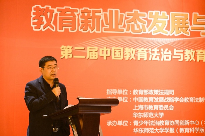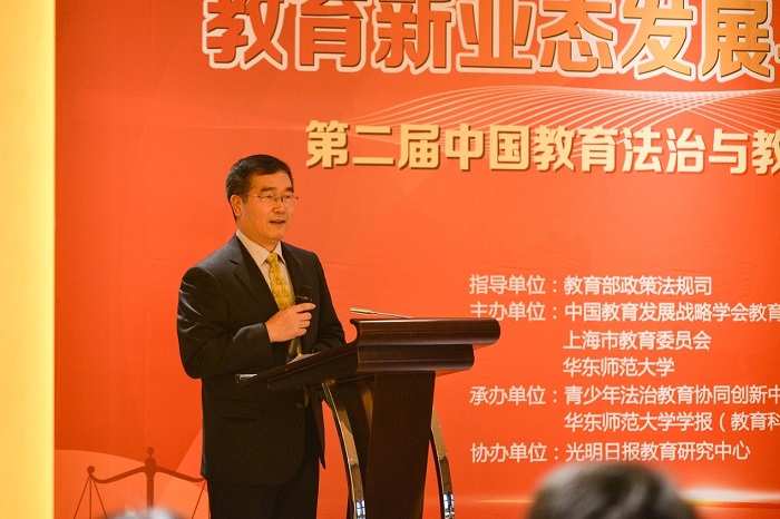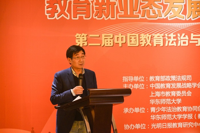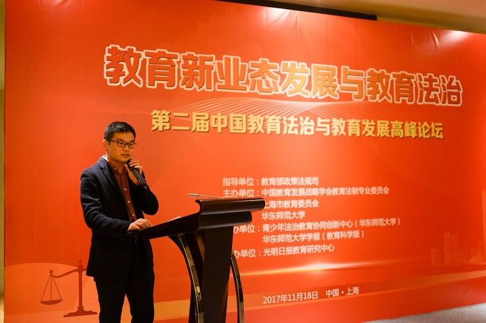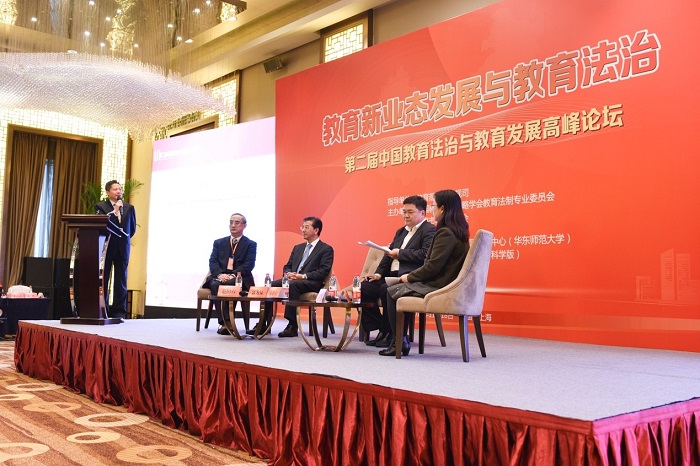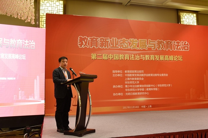 11月18日,由教育部政策法规司发起,中国教育发展战略学会法制专业委员会、上海市教育委员会、yl23411永利集团联合主办,yl23411永利集团、青少年法治教育协同创新中心(yl23411永利集团)、yl23411永利集团学报(教育科学版)承办的第二届“中国教育法治与教育发展高峰论坛”在华东师大举办。论坛聚焦“教育新业态的发展与教育法治”这一主题,围绕“激发新动能:教育的发展走向与政策取向”、“探索新业态:“互联网+教育”的治理改革”、“聚焦新常态:教育法治化治理体系的构建与创新”等前沿问题,吸引了来自教育、法学、公共管理等相关领域的专家学者和科大讯飞、万海龙图、小荧星、精锐教育等教育机构高管进行跨学科、跨领域的对话研讨。
