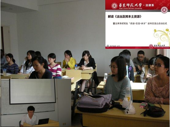 启动仪式后,由2011级研究生吕守一同学作“品读苏力教授的《法治与其本土资源》”的读书报告,通过PPT讲解,分享读书心得,张孟氘氚同学作精彩评述。第一场读书报告的成功为整个读书会系列活动开了个好头,带动法律系研究生们互推好书,自主学习和思考。