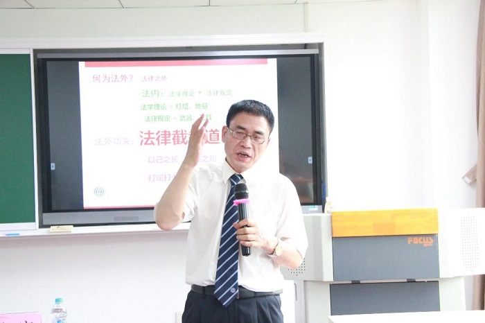 讲座伊始,肖主任从“法律是什么?法条中你不认识的字有几个?法条中,最常用的标点有几个?”三个问题导入,打破了教科书式的思维。随后,肖主任从“自信、思维、语法、文字、逻辑、沟通”六个方面诠释了法律人的“法外功夫”,主张练成“以无法为有法,以无限为有限”,“以己之长,攻彼之短”,“打蛇打七寸,杀猪就一刀”的法律实战技术——“法律截拳道”。