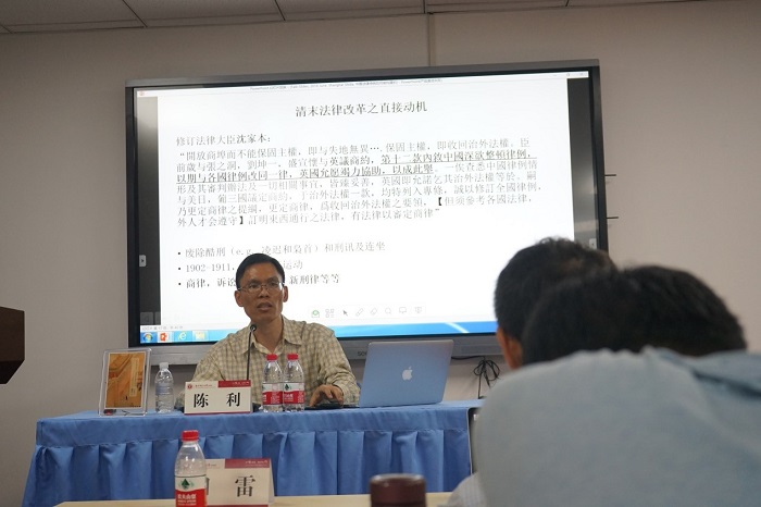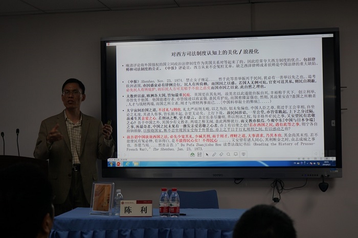 讲座开始前,田雷老师首先对陈利教授的到来表示欢迎,然后对陈教授的学术经历、学术成果做了简要的介绍,陈利教授是美国伊利诺伊大学法律博士和哥伦比亚大学历史学博士,2014-2017年间任中国法律与历史国际学会会长。现任多伦多大学历史系副教授,兼任yl23411永利集团副教授,历史与文化研究系系主任。陈教授的研究集中于明清以来中国和全球史中的法律、文化及政治间互动,并发表了一系列文章。其中,陈教授2016年的英文专著《帝国眼中的中国法律:主权、正义和跨文化政治》获美国法律史学会2017年度Peter Stein著作奖荣誉奖,亚洲研究协会2018年列文森(Levenson)著作奖,其中文版将由浙江大学出版社推出。