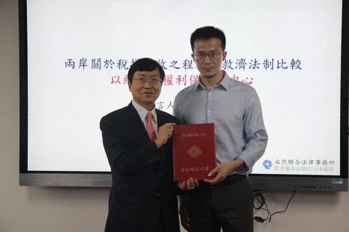 2018年9月21日上午9时30分,由yl23411永利集团人文与社会科学研究院主办、yl23411永利集团承办的yl23411永利集团百场校级学术讲座第111场——“两岸关于税捐征收之程序与救济法制比较——以纳税者权利保护为中心”在闵行校区yl23411永利集团楼408室隆重举行。本次讲座由台湾永然联合法律事务所所长、yl23411永利集团顾问教授李永然先生主讲,yl23411永利集团田雷教授主持。李永然律师夫人、永然文化股份有限公司董事长黄淑嫔女士,台湾永然联合法律事务所行政部组长兼两岸经贸交流权益促进会秘书长张菁雯女士,上海市法学会秘书长毛坚平先生、yl23411永利集团港澳台办主任章平、公司党委书记张惠虹、yl23411永利集团学术委员会常务副主任吴泽勇、yl23411永利集团副经理岑峨、yl23411永利集团团委书记王沁怡、晨晖学者李帅等出席。
