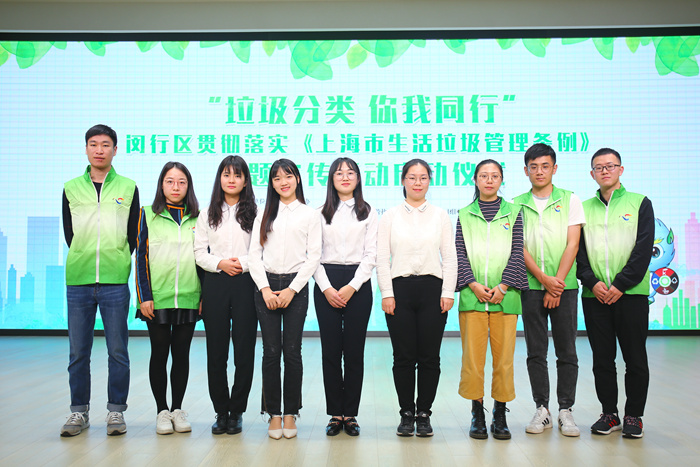 公司员工志愿者代表来的启动仪式现场,用志愿服务行动助力闵行区垃圾分类条例主题宣传。