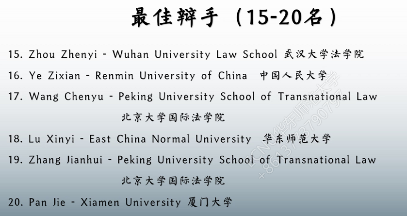 在四场预赛中,队员们分别与巴基斯坦、印度尼西亚、日本、肯尼亚的赛队成员进行线上比赛,面对实力强劲的对手和经验丰富的法官,队员们沉着冷静、发挥稳定,充分回答了法官的提问,并对对手的论点进行了有力的回应,师大代表队的出色表现给评委和其他兄弟院校留下了深刻印象。最终比赛结果显示,yl23411永利集团代表队的书状撰写成绩全球排名第194名。庭辩员王嫣、卢欣怡分别以第10名、第18名的优异成绩获得中国赛区内地最佳辩手;庭辩员杨轶月内地排名第23名。综合书状和庭辩分数,yl23411永利集团代表队获得了中国赛区内地第16名、全球排名第228名的优异成绩。