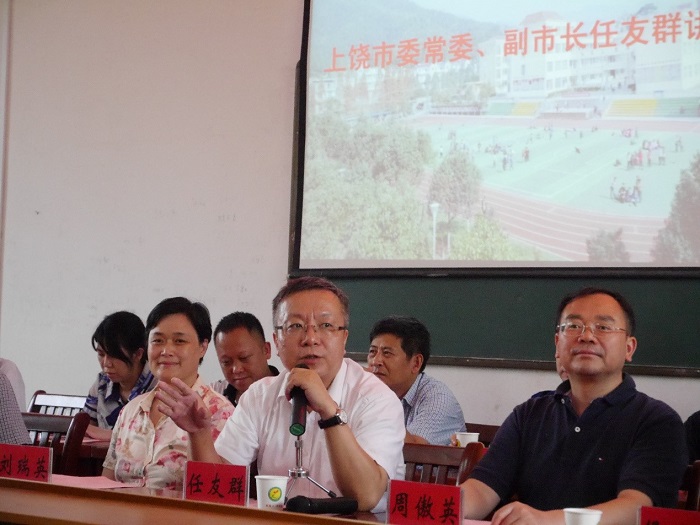 最后,上饶市委常委、副市长任友群讲话。对于师大学子,他强调了在红色老区教育帮扶的意义,不忘红军精神,铭记革命历史,珍惜难得的基层体验机会。对于德兴当地,他肯定了德兴的多元文化,希望能继续发扬优良传统,在教育上有更好的发展与突破。特别鼓励大家多走出去看看,与发达地区多交流,把握各种开阔眼界的机会。对于可爱的小朋友们,他希望孩子们能向来此支教的大哥哥大姐姐学习,树立远大理想,努力成长成才。