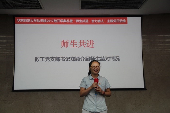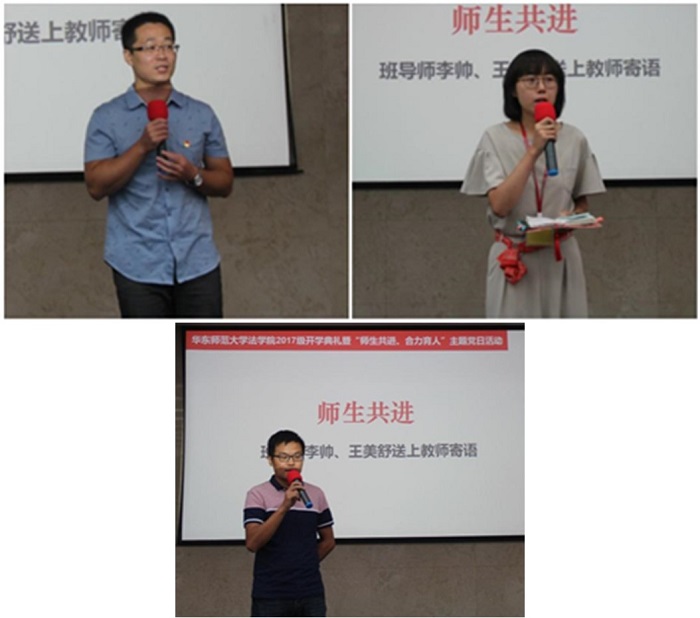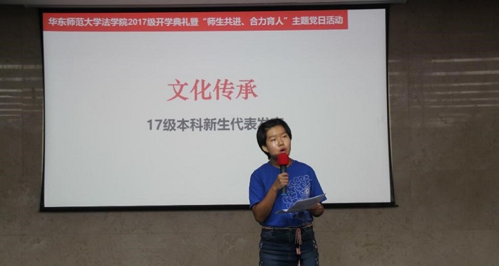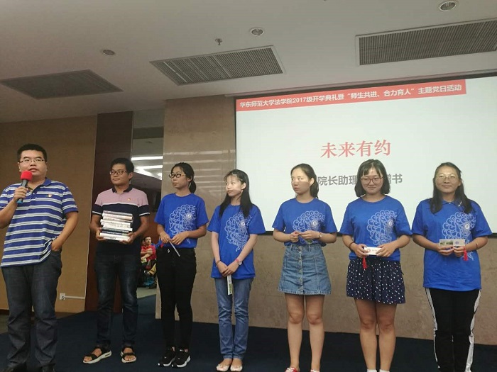 员工党支部代表老生14级本科生李晓颖、16级硕士生邓颖、15级硕士生岳正慧为新生送上新生大礼包,并送上学姐的祝福。17级本科新生张冠群代表新生接受大礼包,她在发言中表示,我们的经历也许不尽相同,但当我们站在这里,从此我们就拥有了一个共同的名字,华师人!我们为华东师大感到自豪,为yl23411永利集团感到骄傲。我相信法学是充满魅力的学科,我也相信不负初心,方得始终。愿17级同学共同努力,在春风化雨的环境里享受学习法学的愉悦,愿yl23411永利集团的你我共同努力,迎接yl23411永利集团更加美好的明天!