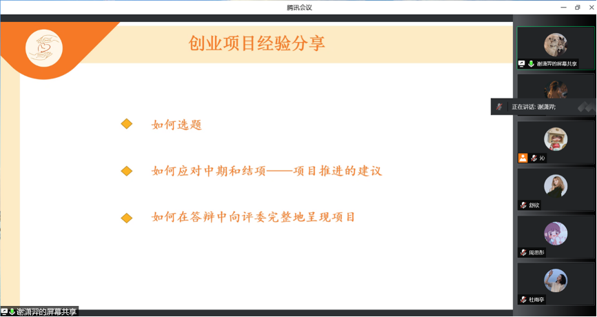 随后,2018级法学专业本科生谢潇羿结合实战经历分享了创业项目选题确定、项目推进和答辩方面的实践经验。她提到,选题要关注热点问题,注重前期调研以便对项目的可操作性进行把握和考量;项目运行阶段要注重团队建设,进行合理、精细化分工并重视时间规划;答辩要着重从项目优势、运行模式、阶段性成果和项目规划等方面进行项目展示。