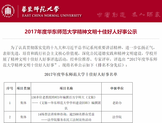 加强校地合作、校企合作,和司法机关、律所、企业等开展全面合作,建立实践基地,选派青年教师挂职锻炼,组织青年教师带队,积极参与上海市“尊法守法•携手筑梦”服务农民工法治宣传行动,组织成立师生宣讲团为农民工开展普法宣讲活动十多场,获得公司2017年度十佳好人好事。