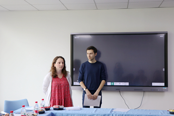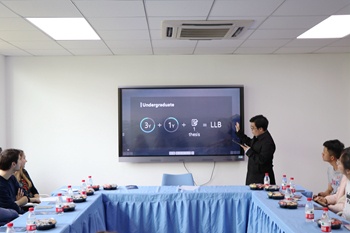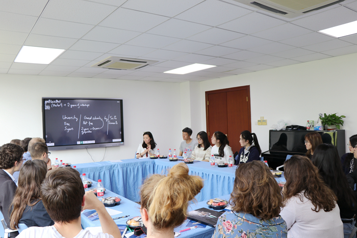 演讲环节依次由公司员工代表刘正宇,法国员工代表伊尔宗德·帕基耶(Hilzonde PASQUIER)和梅尔基奥·拉普拉尼(Melchior LAPLANE)进行发言,分别就两国的法学高等教育进行了展示。刘正宇同学介绍了中国法学教育的历史与现状、核心课程模块以及法律职业发展等内容; 法国同学则介绍了法国法学教育的现状与特点,法律实习与职业选择等内容。发言完毕后由李颖轶老师进行点评、补充、对比和总结,并进一步介绍了法国二元司法体制对法学教育的影响,独特的律师公司制度和大学教授考试制度等。通过演讲环节,大家对两国的法学专业人才培养模式和就业前景都有了更加深刻的认识,也增进了对彼此法律文化的兴趣和了解。