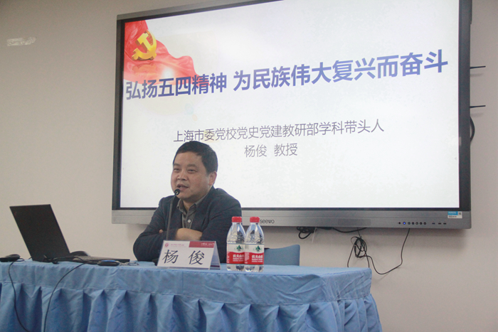 杨俊教授的专题讲座从“五四运动的深刻背景”、“五四精神的核心理念”、“中国共产党员是五四精神的继承人”、“为民族复兴人民幸福而奋斗”四部分内容展开。