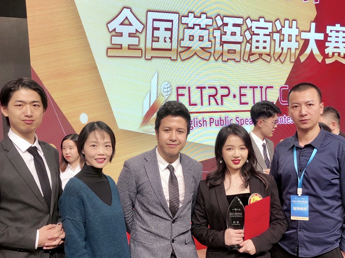 王嫣同学坦言,成功的背后是勇气和坚持的支撑。决赛赛程安排紧张,长达一周的比赛期间,新话题不间断发布,为充分备战,她每天睡眠不足六小时。在这种全身心投入的备战状态下,王嫣同学以充实且富有感染力的演讲表达和灵活大气的临场应对,赢得了观众和评委的一致好评。同时,指导老师、外语公司赵朝永老师获指导教师特等奖。