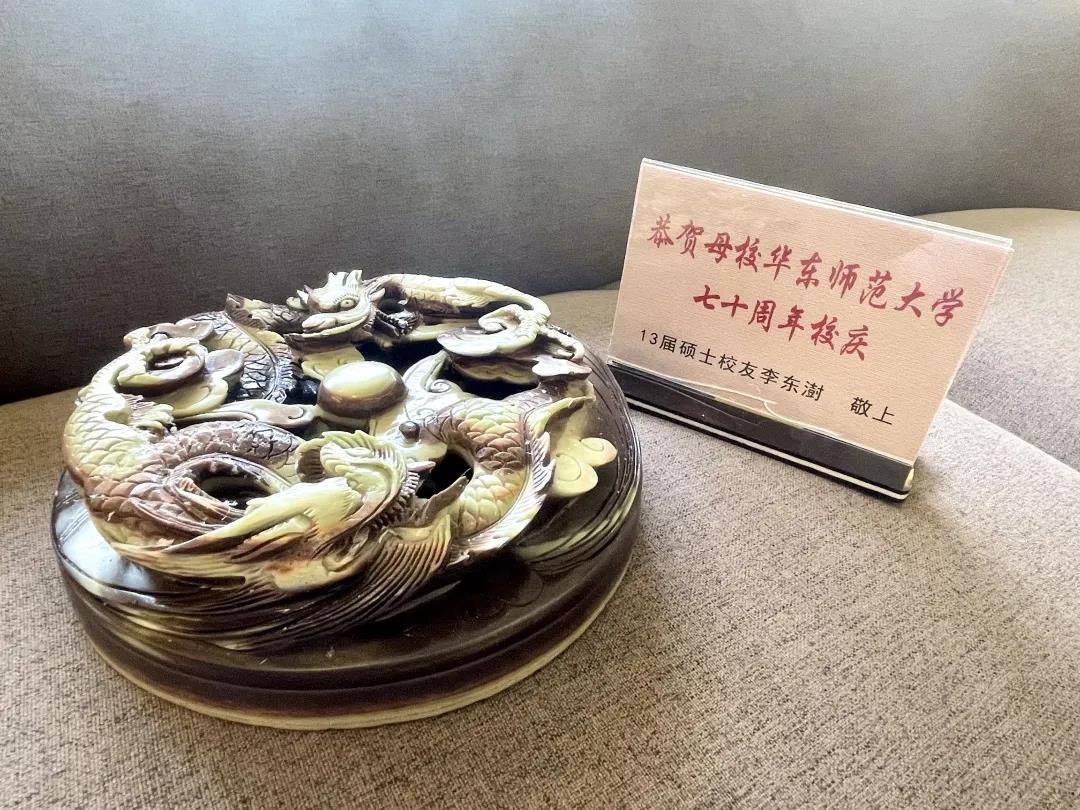 贺礼说明:双龙石砚,以贵州梵净山区上乘紫袍玉带石为料,由贵州省毕节市织金县著名雕刻艺术家马志举精心制作。紫袍玉带石以紫为基、绿条相间,恰如古代文人志士着紫袍、缀玉带;织金石雕艺术始自明末清初,巧夺天工、源远流长。砚台系文房四宝之一,龙乃华夏图腾;紫气东来,玉带横贯,寓华师学子抱兼济四宇之志,怀经天纬地之才。