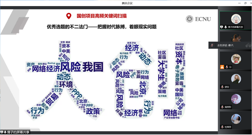 随后,2018级法学专业本科生谢潇羿结合实战经历分享了创业项目选题确定、项目推进和答辩方面的实践经验。她提到,选题要关注热点问题,注重前期调研以便对项目的可操作性进行把握和考量;项目运行阶段要注重团队建设,进行合理、精细化分工并重视时间规划;答辩要着重从项目优势、运行模式、阶段性成果和项目规划等方面进行项目展示。