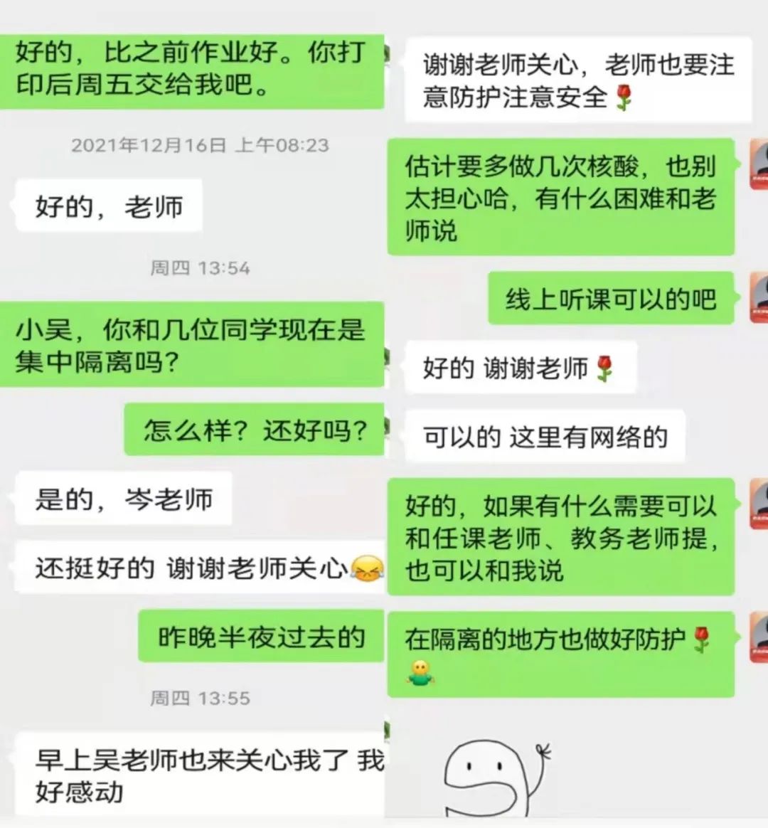 17日,因为个别员工集中隔离,公司人生导师第一时间关心和问候他们在隔离期间的生活、学习等状况,鼓励同学们共同度过难关。