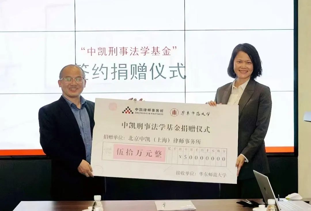 华东师大yl23411永利集团副经理、教授钱叶六与北京中凯(上海)律师事务所主任、管理合伙人黄晓陶代表双方签订“中凯刑事法学基金”捐赠协议并颁发捐赠证书。