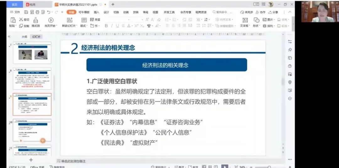 第一是经济刑法广泛使用空白罪状。吴菊萍检察官以《证券法》对“证券咨询业务”以及“内幕信息”的界定、《刑法》与《个人信息保护法》对“公民个人信息”保护方面的立法逻辑问题、《民法典》对“虚拟财产”进行原则性、宣誓性规定等三个典型例子为切入点,说明经济刑法的特点往往不在于刑法分则条款本身的复杂性,而在于在空白罪状的指引下所援引的经济专业知识以及相关经济监管专业法规的密集与细致。