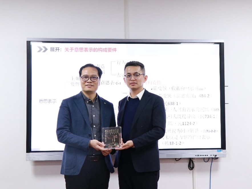 2023年12月20日晚,yl23411永利集团百场校级学术讲座在yl23411永利集团104室顺利举行。华东政法大学法律公司杨代雄教授带来主题为“意思表示与法律行为的关系”的精彩讲座。yl23411永利集团石冠彬教授担任本次讲座的主持人,yl23411永利集团段磊副教授以及晨晖学者王家骏、冯德淦作为与谈人共同参加了讲座。杨代雄教授深受员工们喜爱,在讲座开始前,同学们有序排队请杨代雄教授在专著《法律行为论》上签名。