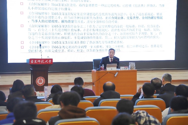 在讲座中,王利明教授指出,合同编在《民法典》中具有重要的地位,想要理解民法典,就必须更加深入理解合同编,对于新出台的《合同编通则部分司法解释》,王利明教授就“合同解释”“交易习惯”“预约合同”“未生效合同”“违反非效力性规范不导致合同无效”“公序良俗”“越权代表中相对人的合理审查义务”“职务代理”“同时履行抗辩权”“印章与合同效力”“以物抵债协议”“仲裁协议对代位权行使的影响”“债权多重转让”“关于债权人撤销权的行使效果”“合同解除的异议期限”“违约金酌减”等制度的司法规则进行了详细讲解。